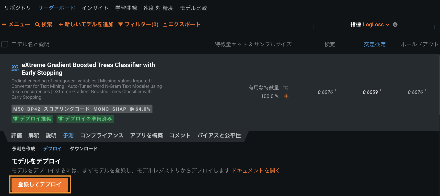 リーダーボードで、予測の生成に使用するモデルを選択します。 デプロイ推奨とデプロイの準備済みのバッジが付いたモデルをお勧めします。 モデル準備プロセスでは、特徴量のインパクトが実行され、特徴量の数を減らした特徴量セットでモデルが再トレーニングされて、より大きなサンプルサイズでトレーニングされた後、サンプル全体(日付/時刻で分割されたプロジェクトの最新データ)でトレーニングされます。