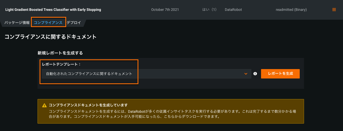 コンプライアンスドキュメントを生成するには、DataRobotが多くの従属インサイトタスクを実行する必要があります。 これは完了するまで数分かかる場合があります。 完了すると、以下に示すようにドキュメントが表示されます。