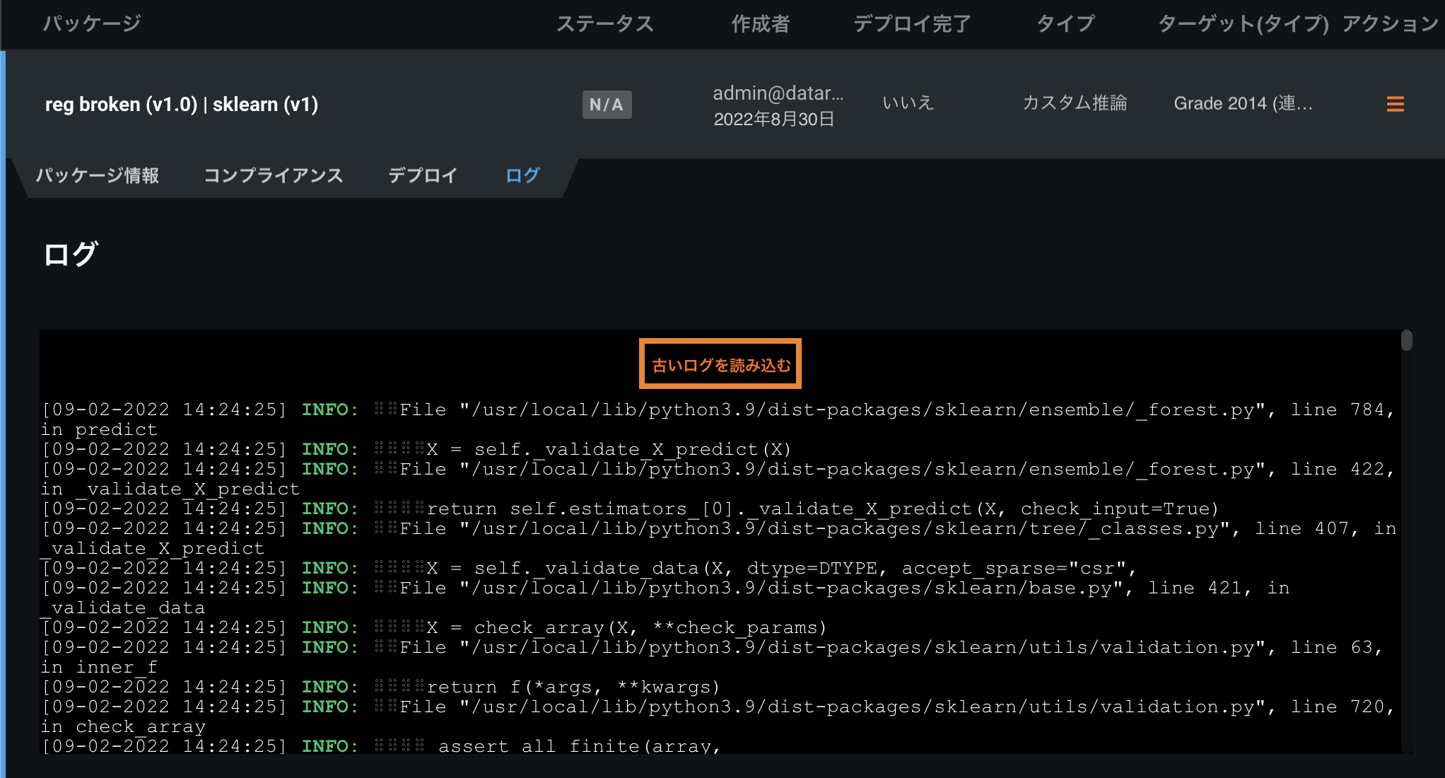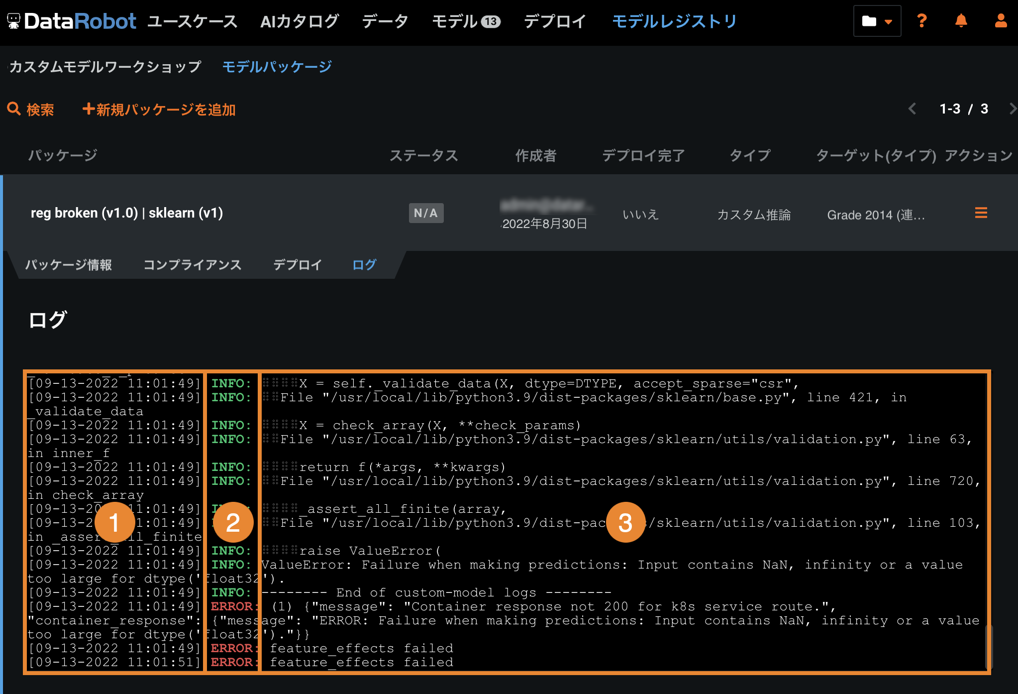 モデルレジストリの使用非推奨(レガシー)のモデルパッケージタブにおいて、モデルログタブには、基になるモデルの操作に関する情報が表示されます。 この情報は、エラーの特定と修正に役立ちます。 たとえば、コンプライアンスドキュメントの生成では、DataRobotが多くのジョブを実行する必要があり、その中には順次実行されるものと並行して実行されるものがあります。 これらのジョブは失敗することがあり、ログを確認することで失敗の原因を特定できます(たとえば、モデルがNull値を扱わないために「特徴量ごとの作用」ジョブが失敗した場合など)。