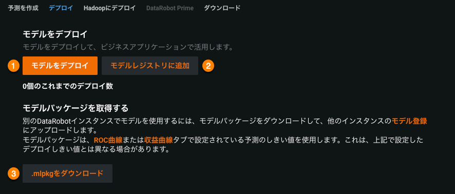 予測 > ダウンロードタブのMLOpsパッケージオプションを使用すると、デプロイタブが開き、モデルをデプロイしたり、モデルレジストリに追加したり、モデルパッケージをダウンロードしたりできます。
