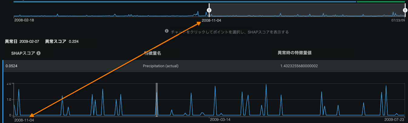 ページの下部にある時間セレクターを使用して、関心のある日付範囲を選択します。 時系列の異常チャートとサマリーチャートの両方が更新され、選択した時間ウィンドウが反映されます。