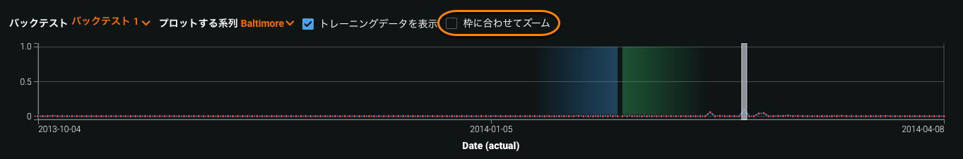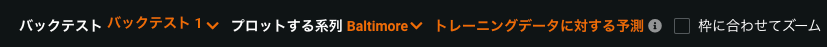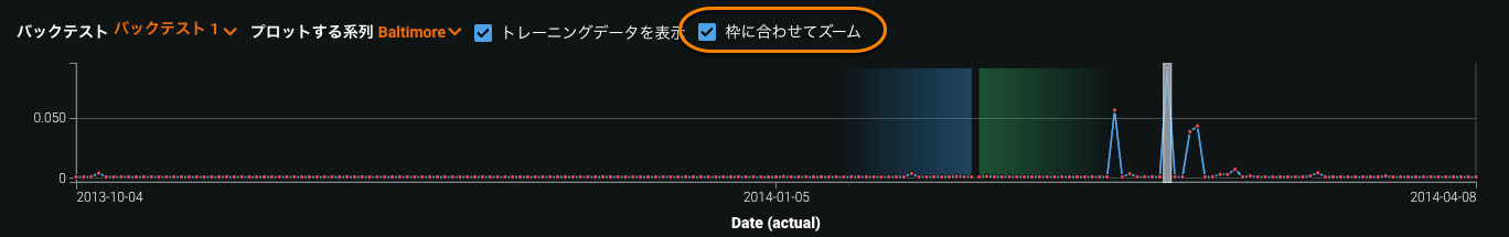 ドロップダウンを使用して、特定のバックテストまたはホールドアウトパーティションを選択します。 チャートが更新され、その日付範囲内のデータのみが含まれます。 複数系列プロジェクトの場合は、追加のドロップダウンを使用して目的の系列を選択できます。
