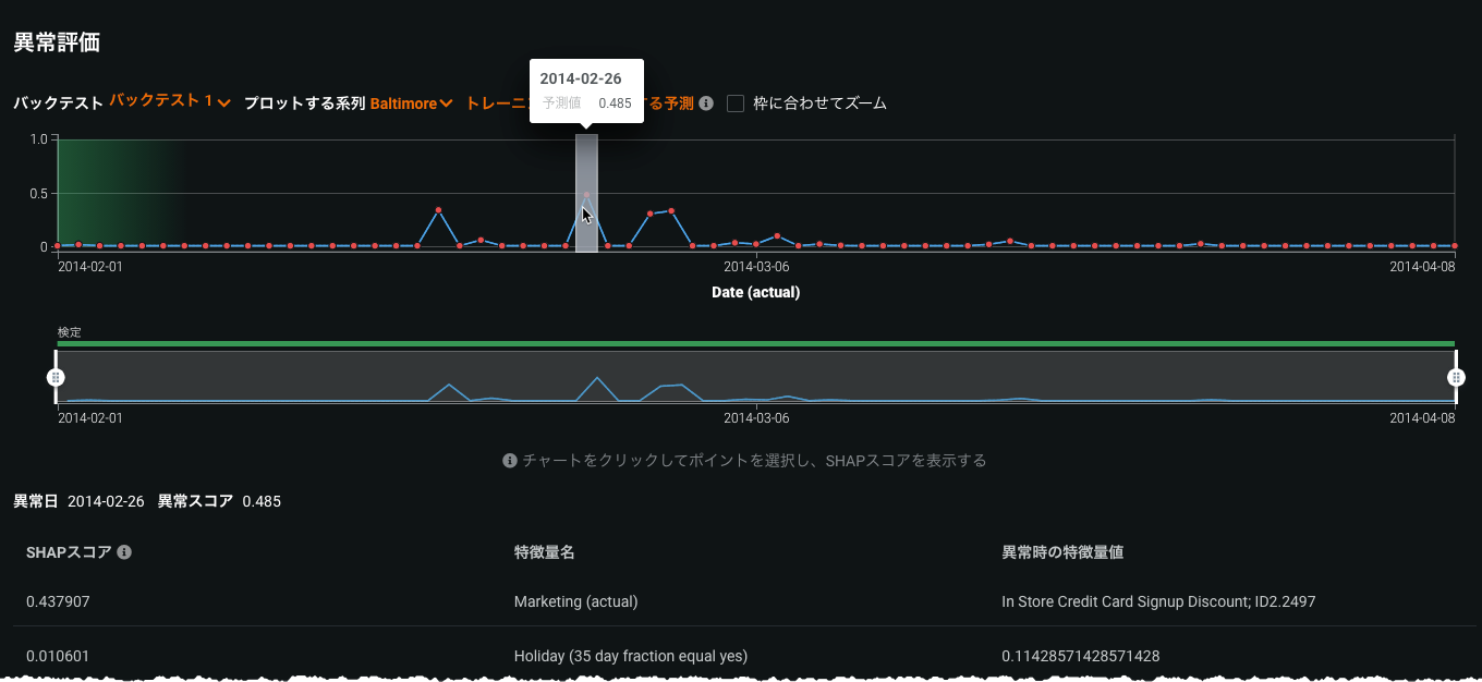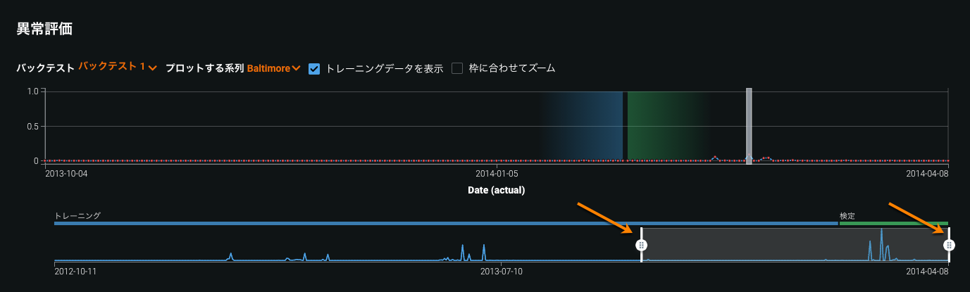 白いバーは、チャート全体に設定された場所に基づきます。 選択した異常ポイントがトレーニングデータ内にあり、トレーニングデータを表示が選択されていない場合、バーは表示されません。