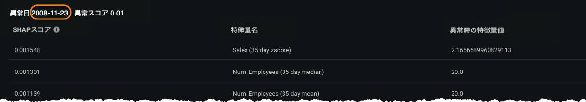 メインチャートの白い垂直バーは、SHAP説明の表示を制御するセレクターとして機能します。 チャートを各部分をクリックすると、説明(スコア)のリストが変化します。 たとえば、2008年11月23日の異常スコアはかなり低く、特徴量「売上」の派生が最も影響を及ぼしました。