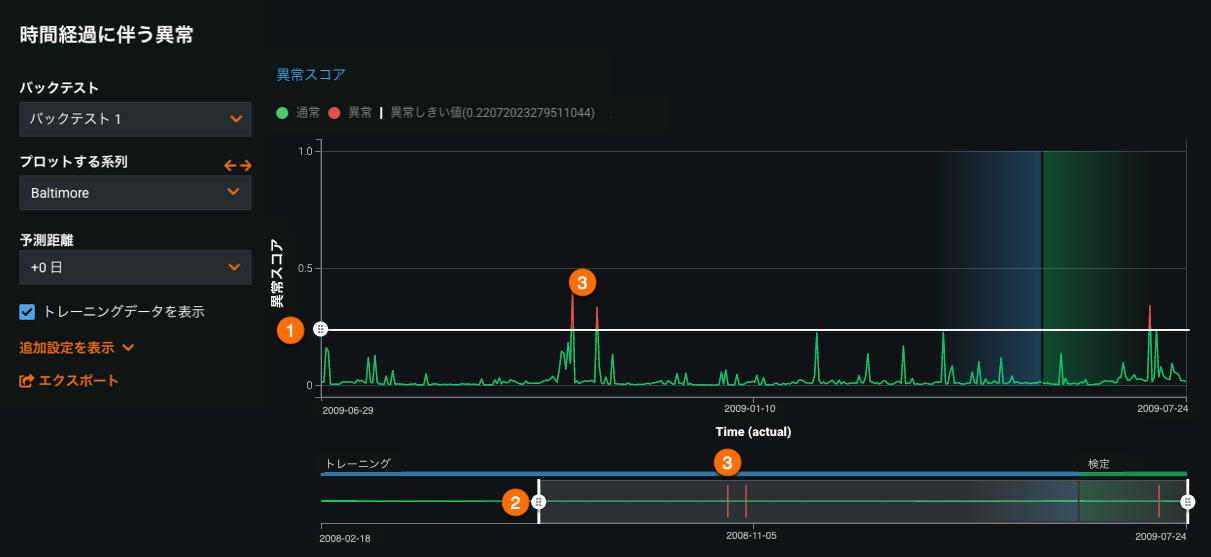 時間経過に伴う異常の視覚化は、データのタイムライン全体で異常がいつ発生するかを理解するのに役立ちます。 これは、非異常の時系列の精度チャートと同様に機能します。 設定可能な要素(バックテスト、予測距離など)および表示の制御の詳細については、そのチャートの説明を参照してください。