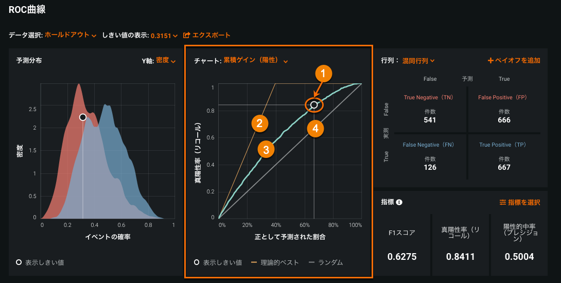 要素 説明 1 表示しきい値 ROC曲線タブの可視化ツールで管理する表示しきい値に相当します。 曲線にカーソルを合わせ、曲線上の新しいポイントに円を移動し、クリックして新しいしきい値を選択することで、新しい表示しきい値を選択できます。 2 最良曲線 理論的に最良のモデルを示します。 3 実測曲線 実測リフトまたはゲイン曲線を示します。 この例は、Positive累積リフト曲線を示しています。 4 最悪曲線 ランダムモデルを示します。
