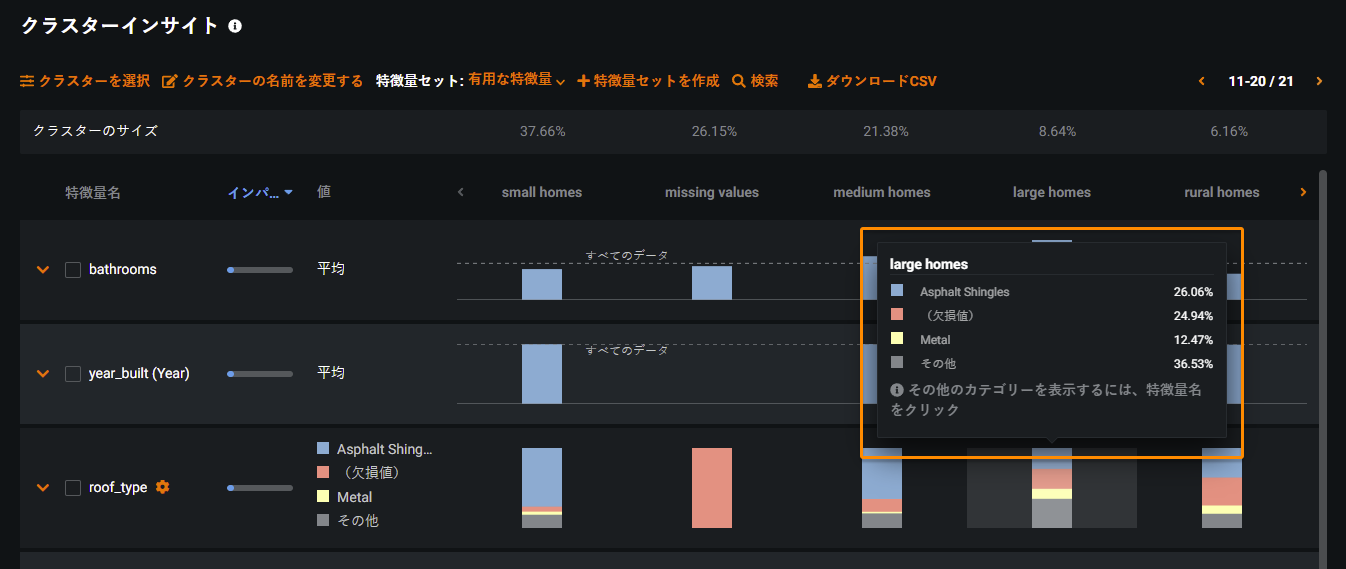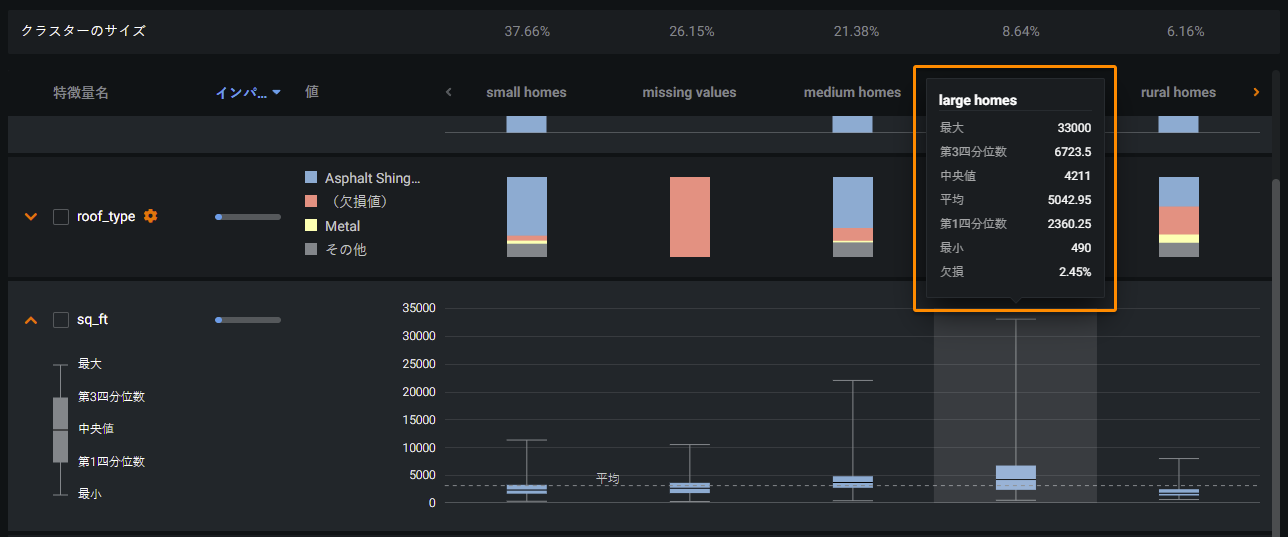 特徴量名の近くをクリックして、展開します。 各クラスターの青いバーにカーソルを合わせると、最大値、中央値、平均値、最小値、欠損割合、第1四分位数、第3四分位数が表示されます。