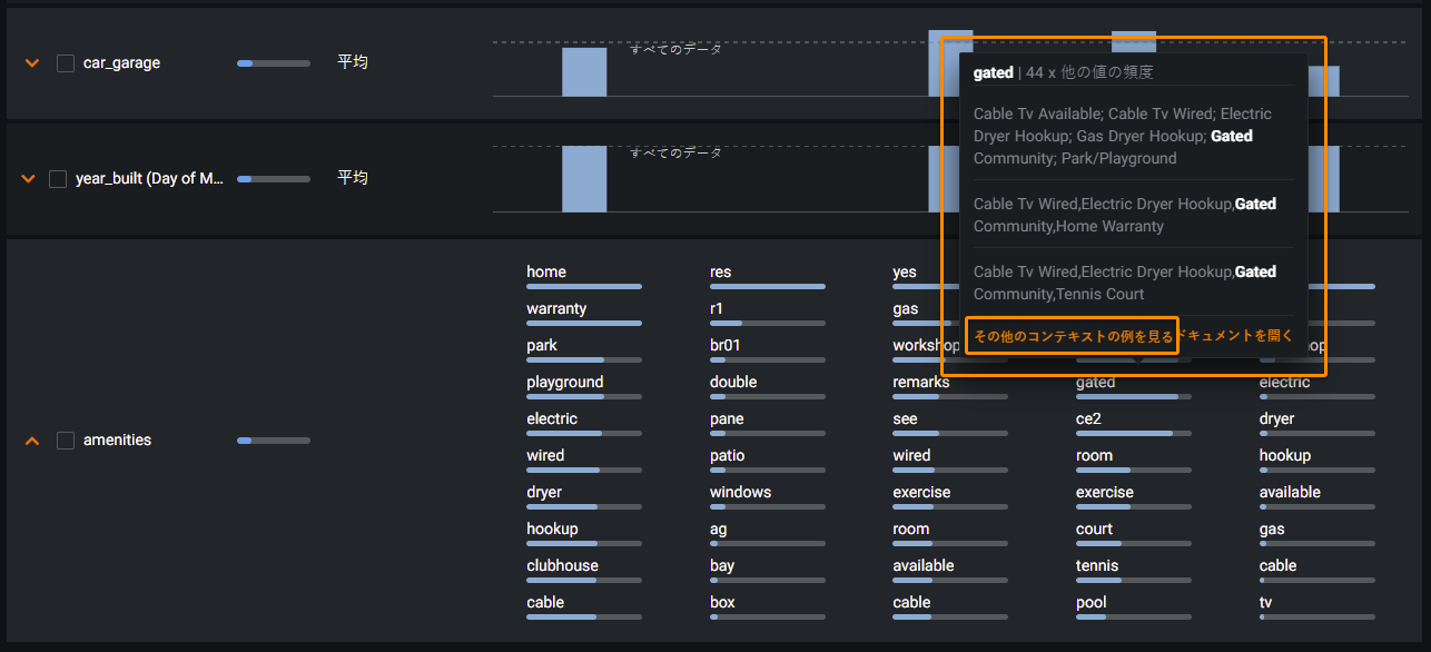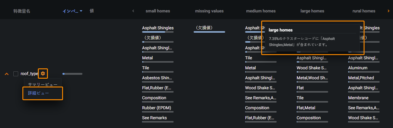 カテゴリーを掘り下げるには、特徴量名の横にある歯車アイコンをクリックして、高カーディナリティビューを選択します。 カーソルを合わせると、各値があるレコードの割合が表示されます。