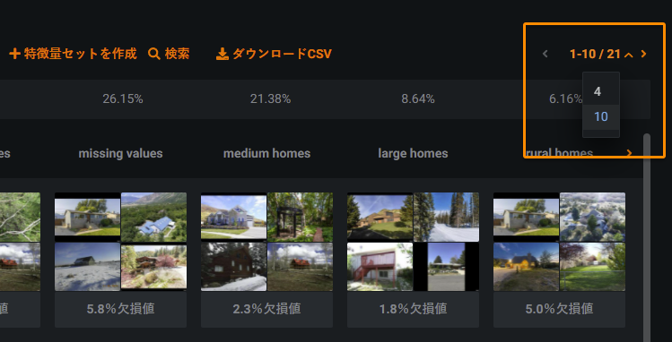 デフォルトでは4つの特徴量が表示されますが、特徴量ページコントロールをクリックして10を選択することで一度に10個の特徴量を表示できます。