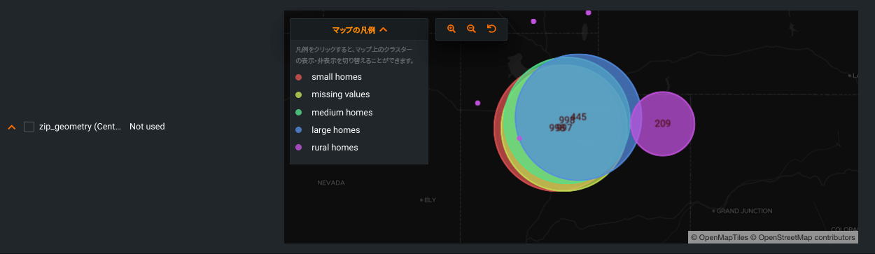 個々のクラスターを表示するには、マップ凡例をクリックし、クラスター名をクリックしてクラスターを非表示にします。 マップビジュアライゼーションにはズームボタンが含まれます。
