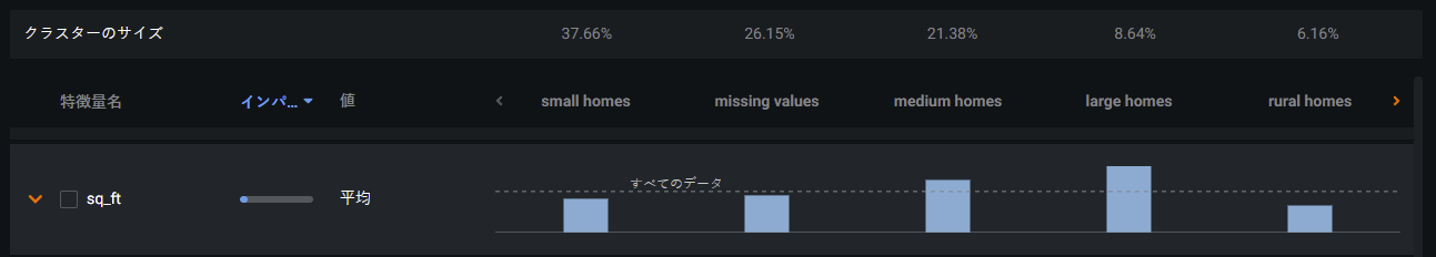 以下のセクションでは、クラスター特徴量の調査に使用する可視化ツールを示します。 サンプルデータセットには、住宅データを表す特徴量が含まれます。