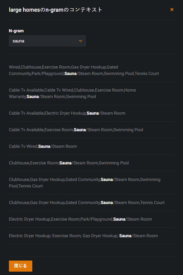 クラスター内のn-gramにカーソルを合わせると、単語が含まれるサンプル文字列が表示されます。