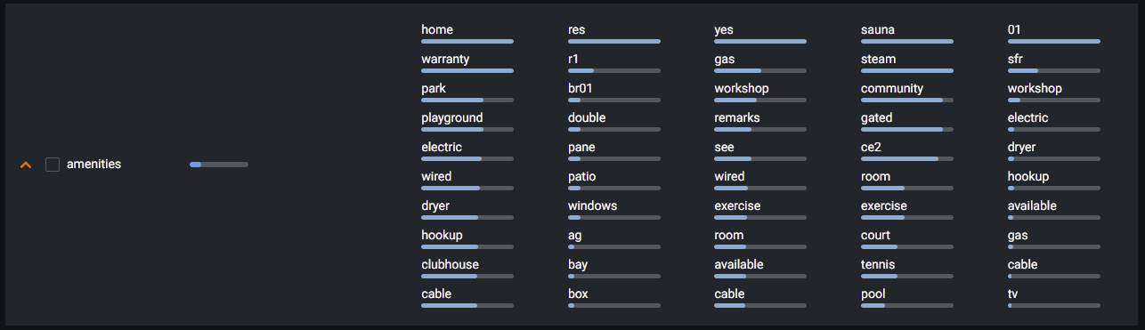 テキスト特徴量の場合、クラスターインサイトは有用性でランク付けされたn-gramを表示します(有用性が高い順)。 これらは相対的な有用性を表す青いバーとして表示されます。 実際の有用性値を表示するには、 CSVをダウンロードします。