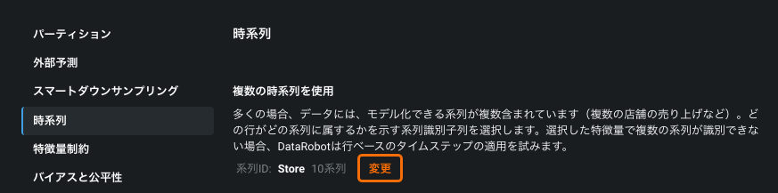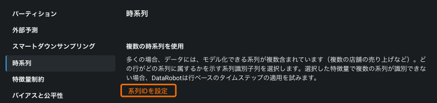 DataRobotでデータ内に複数の系列が検出されない場合、手動で系列IDを設定することができます。系列IDが有効な場合は、複数系列モデリングを使用できます。 系列IDを手動で設定するには: