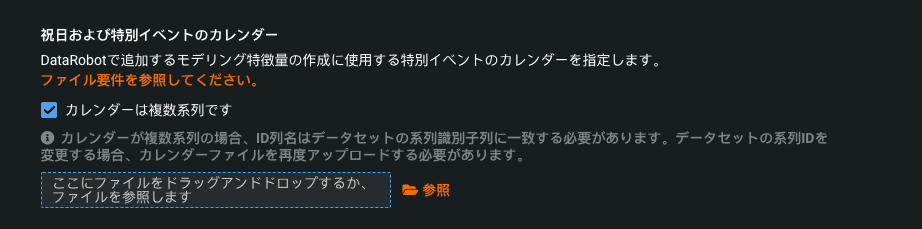 複数系列が必要な場合がDataRobotで自動的に検出され、以下に説明する複数系列モデリングのワークフローが提供されます。 複数の系列が存在する場合、またはDataRobotで系列が検出されない場合があるので、系列IDを手動で割り当てることができます。