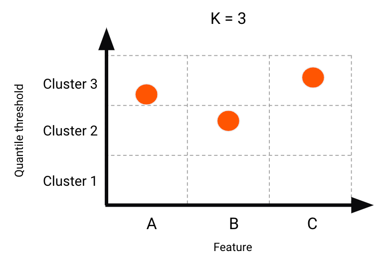 - 特徴量の集計に該当する分位点を決定し、その特徴量をそのクラスターに割り当てます。