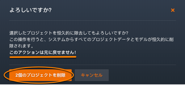 警告メッセージが表示され、プロジェクトを本当に削除するかどうかを確認します。
