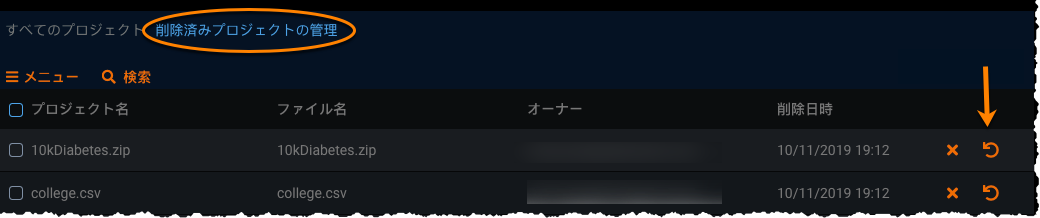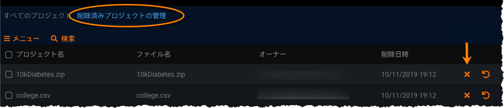 削除済みプロジェクトの管理タブでは全ユーザーの全ての削除済みプロジェクトが表示されます。