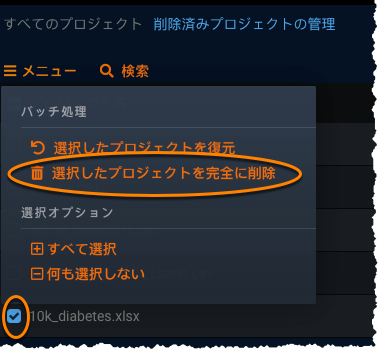 - 一度に複数プロジェクトを削除する場合—削除する各プロジェクトのチェックボックスを選択するか、メニューからすべて選択を選びます(全プロジェクトを削除する場合)。