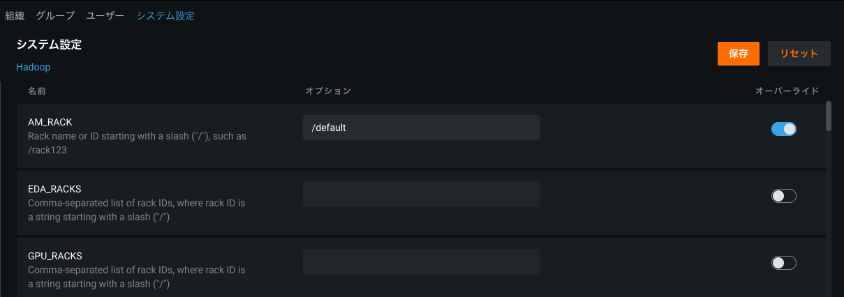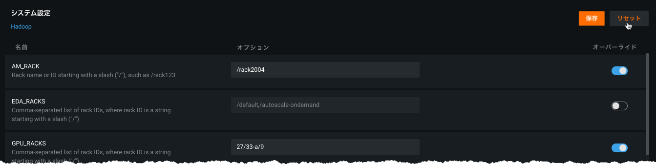 config.yaml値に戻すには:- 個々の値に対して、上書きオプションをオフにします。