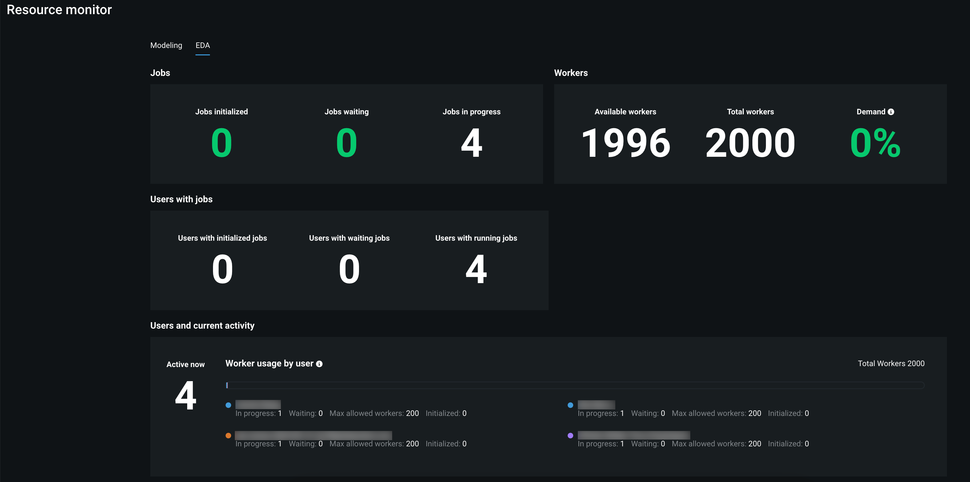 リソースモニターのEDAタブには、 EDA1および関連タスクに使用されている設定済みワーカーの数が報告されます。