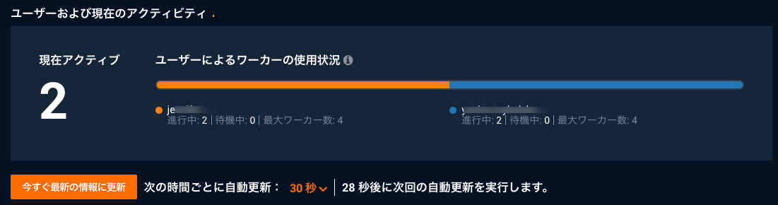 | 現在アクティブ | モデリングワーカーを必要とする実行中または待機中のジョブを持つユーザー数。 この値は、使用中と保留中のジョブフィールドの合計に一致します。 |