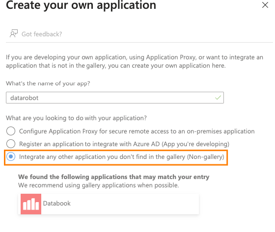 Azure Active Directory > Enterprise applicationsに移動し、+ Create your own applicationをクリックします。