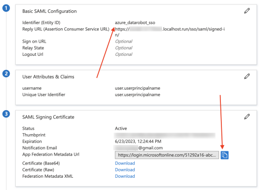Identifier (Entity ID)とApp Federation Metadata URLをコピーします。これらの値は、DataRobotでSSOを設定するために必要になります。