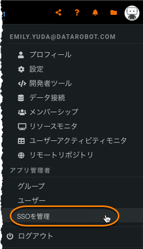 以下では、DataRobotで使用するSAML SSOを有効にするために必要な設定について説明します。 管理者は、DataRobobtのSAML SSO設定ページで設定に必要な情報にアクセスできます(設定 > SSOを管理からアクセスできます)。