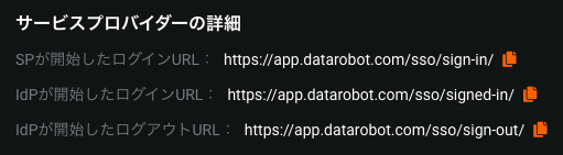 DataRobotでこの情報を取得するには、/admin/organizations/manage/<org_id>/ssoに移動し、URLの詳細が一覧表示されているサービスプロバイダーの詳細を見つけます。