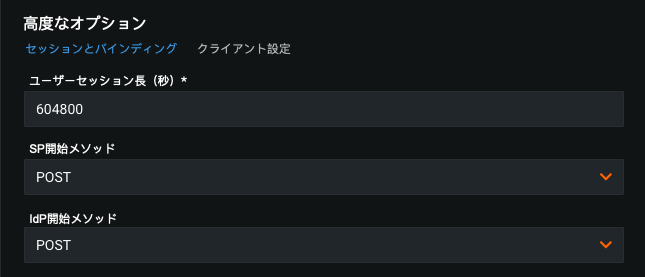 | ユーザーセッション長(秒) | セッションクッキーの有効時間。 デフォルトの長さは1週間です。 この数を減らすと、IdPへの認証要求の割合が増加します。 |