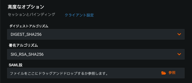 | SAML設定 | SAMLクライアント設定を微調整するJSONファイル(秘密鍵の設定など)。 |