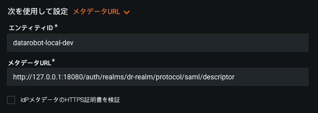 | メタデータURL | インテグレーション固有の情報を含むXMLドキュメントをポイントするURL(IdPが提供)。 エンドポイントは、DataRobotアプリケーションからアクセスできる必要があります。 (ローカルファイルの場合は、メタデータファイル オプションを使用します。 URLでファイルのダウンロードがトリガーされる場合は、ダウンロードされた場合でも、ダウンロードされたメタデータXMLファイルに対してメタデータファイルオプションを使用します。) |