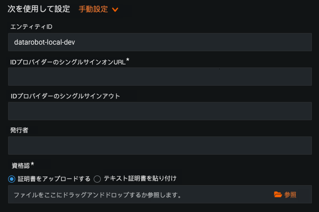 | 発行者 | これはIdP設定でDataRobot用に作成したSAMLアプリケーションから取得されます。 備考:これはDataRobot UIでオプションとして表示されていますが、オプションではないので正しく設定する必要があります。 |