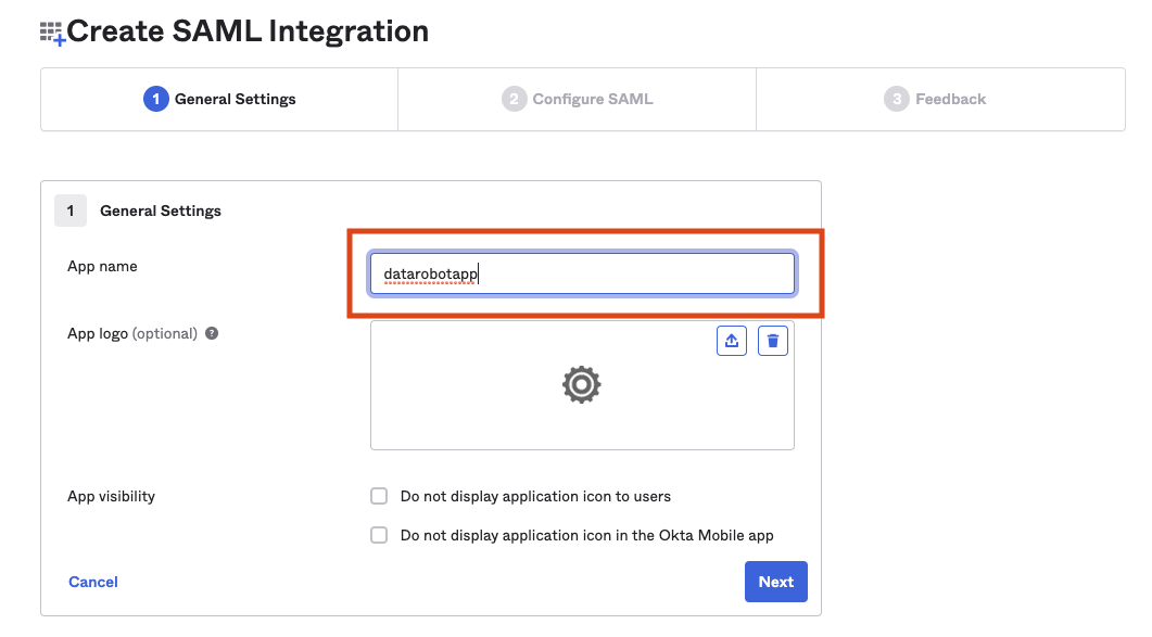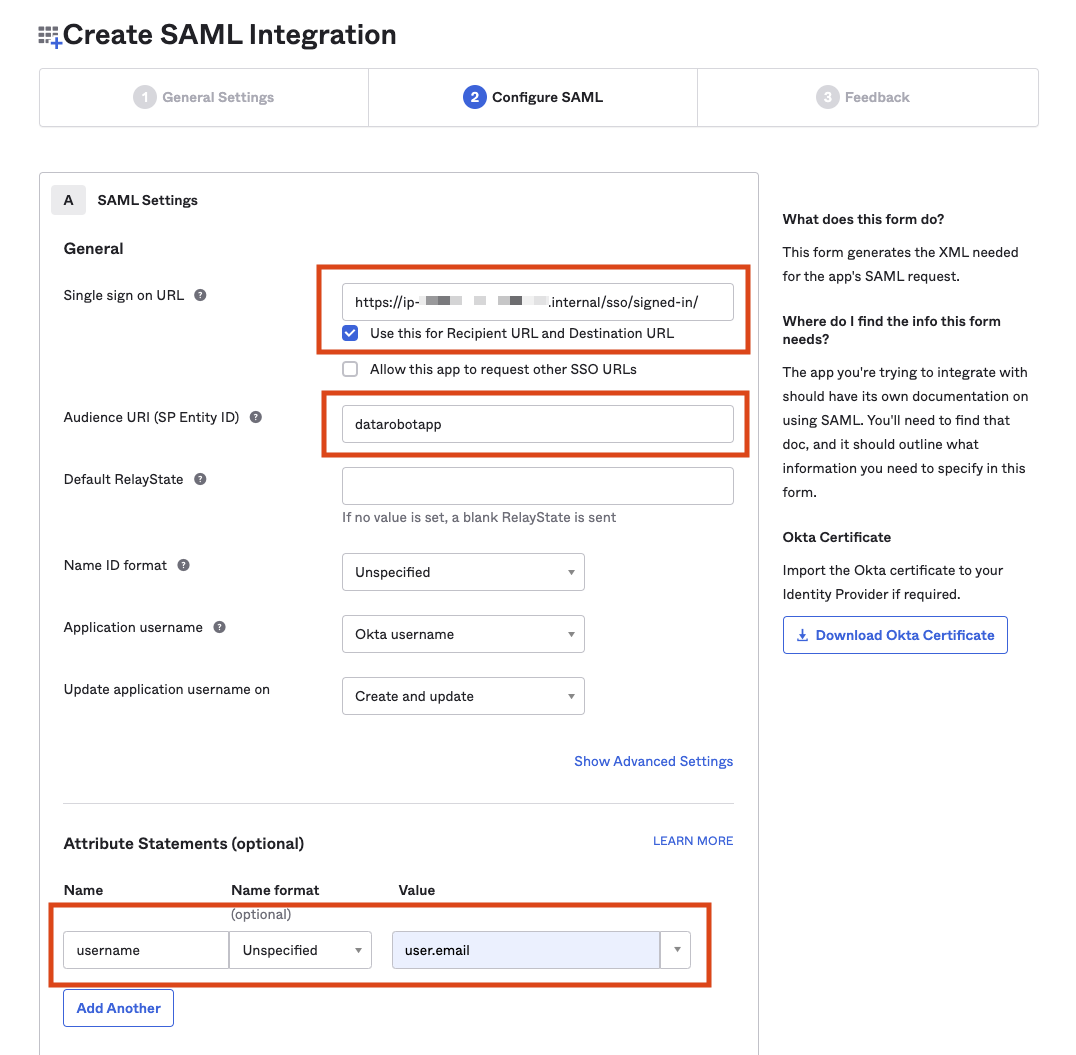 IdPを設定するときは、IdPで新しいSAMLアプリケーションを作成し、サービスプロバイダー(SP)へのサインインおよびサインアウトのURLを指定して、DataRobotをSPとして識別する必要があります。