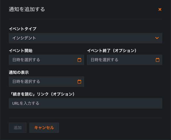 | イベント終了(オプション) | イベントが終了する時刻。 カレンダーモーダルを使用して、日付と時刻を示します。 に通知を表示します |