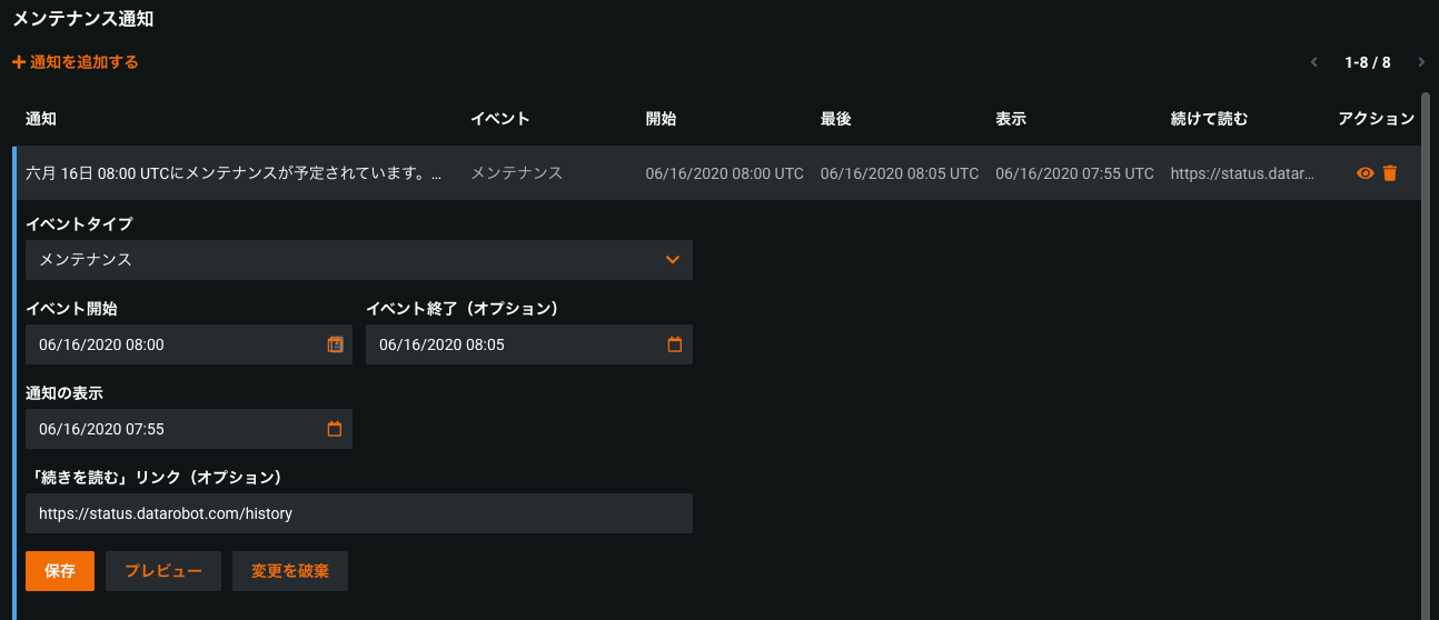 作成したメンテナンス通知はダッシュボードから編集できます。 通知を選択して展開し、フィールドを編集します。