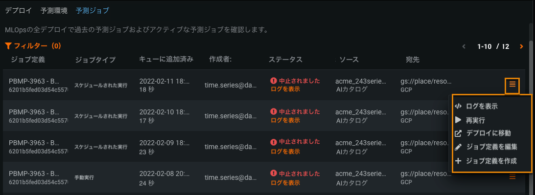3 ジョブソース フィルターするジョブソースタイプを次の中から選択します。 - バッチ予測ジョブ(スケジュールされた実行、 手動実行)