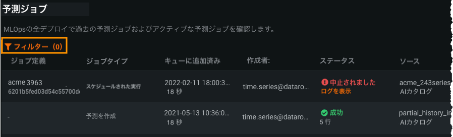 予測ジョブタブでフィルターリンクを選択します。