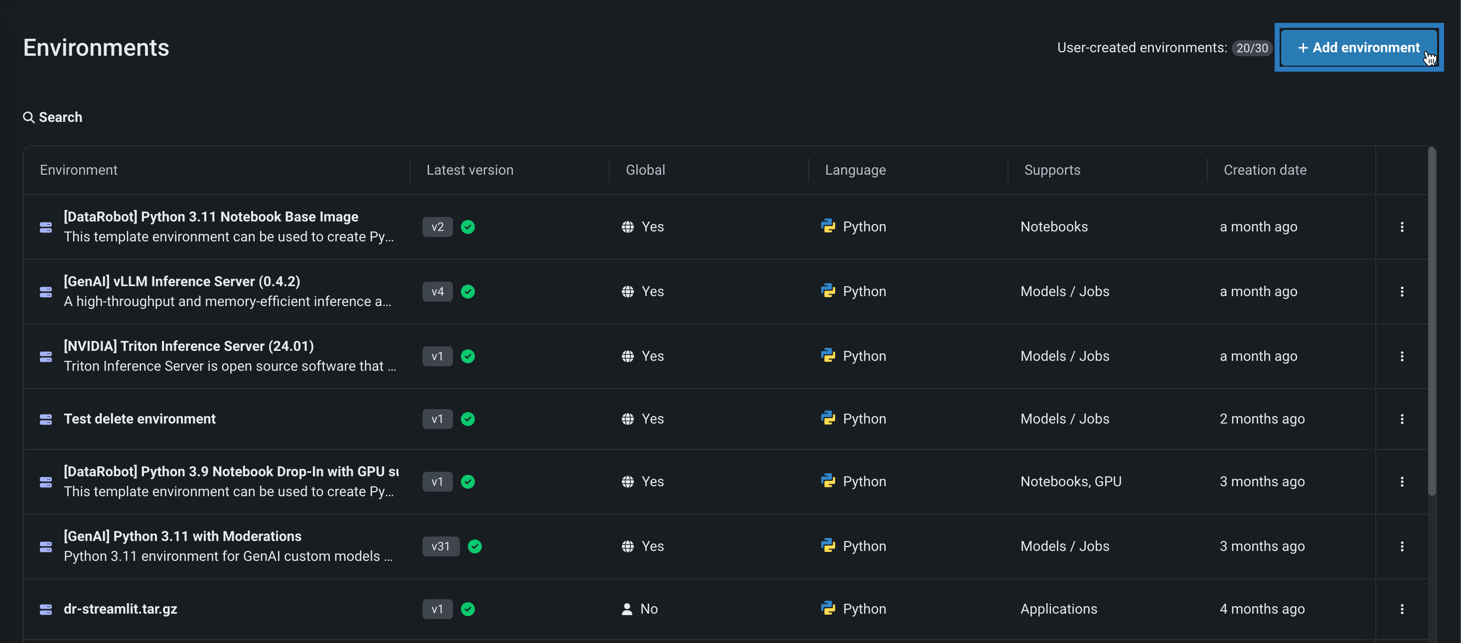 NextGenのレジストリに「環境」タブが提供されました。このタブでは、カスタムモデル、ジョブ、アプリケーション、ノートブックのカスタム実行環境を作成および管理できます。