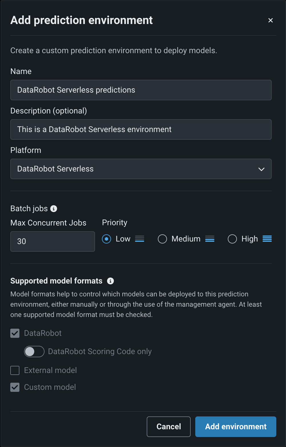 DataRobotのサーバーレス予測環境を作成し、構成可能なコンピューティングインスタンス設定でスケーラブルな予測を行います。 DataRobotのサーバーレス予測環境を作成するには、予測環境を追加する際に、DataRobotサーバーレスプラットフォームを選択します。
