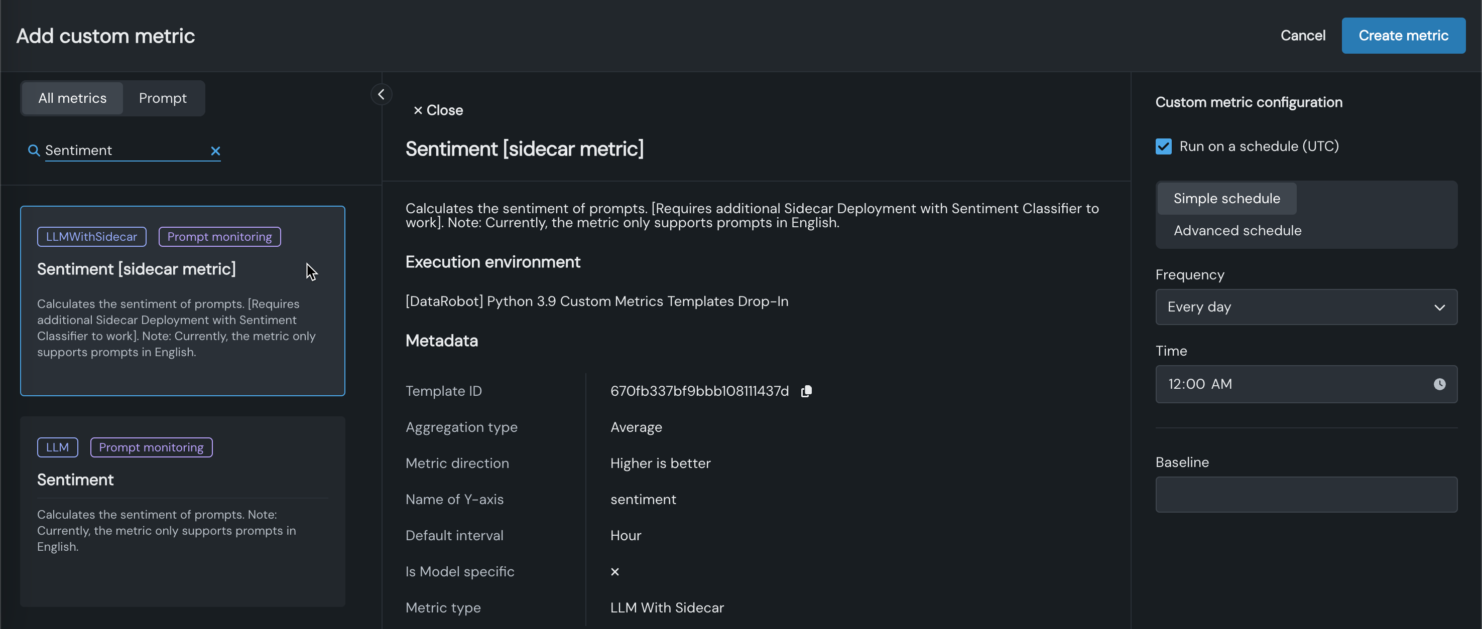 ホストされたカスタム指標を使用すると、組織独自の指標をデプロイに実装し、カスタムジョブのインフラストラクチャで指標計算を実行できます。 カスタム指標ギャラリーは、予測モデルと生成モデルで、ホストされた各種カスタム指標を実装する、事前に作成された、再利用可能で共有可能なコードの一元化されたライブラリを提供します。