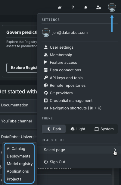 特定のアセットへのパスを指定せずにDataRobotアプリケーションのホームページを開くと、NextGenのホームページが表示されるようになりました。 デフォルトのホームページはユーザー設定で指定できます。また、いつでも設定ドロップダウンからDataRobot Classicに戻ることができます。