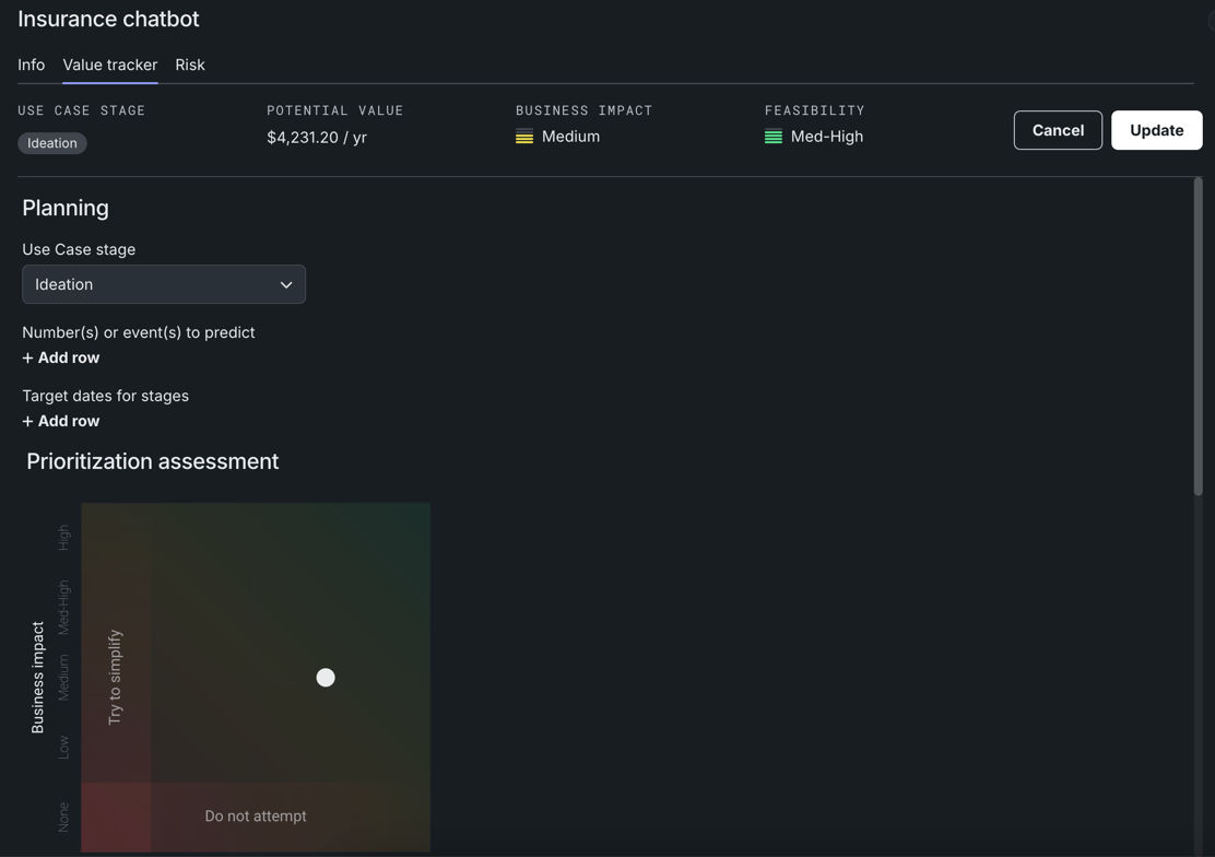 - ユースケース管理ページでは、コメントや説明を追加したり、タグやユーザーを管理したり、バリュートラッカーやリスク評価・管理ツールにアクセスしたりすることができます。