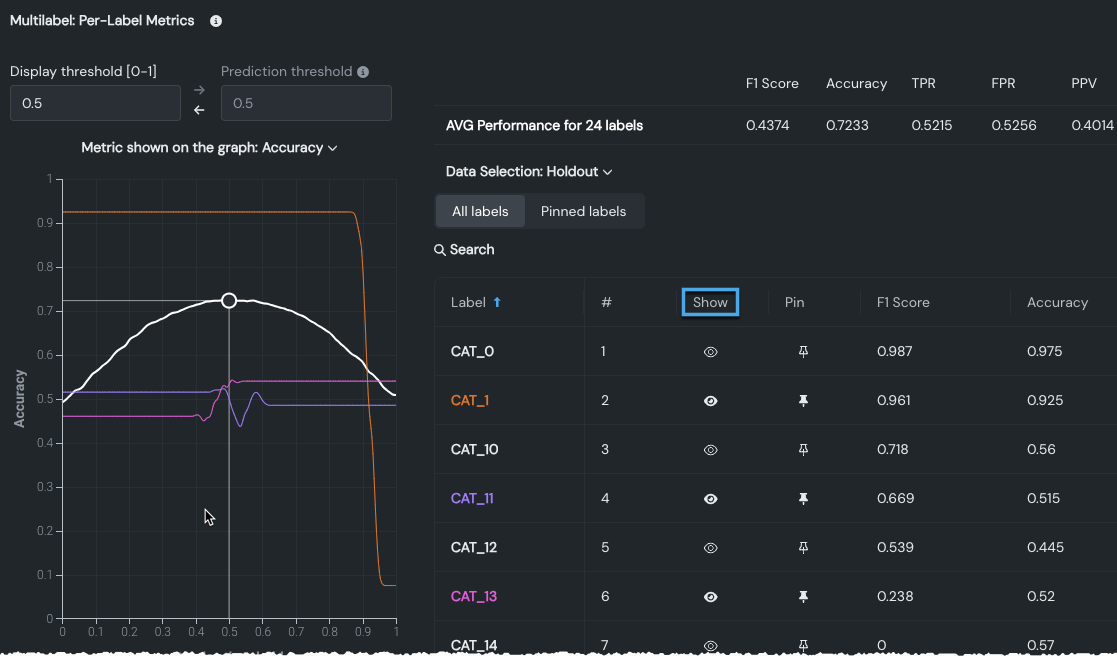 予測モデリングで多カテゴリーのターゲットがサポートされるようになり、多ラベルモデリングのエクスペリメントを構築できるようになりました。 多ラベルモデリングは分類タスクの一種で、データセットの各行を1つ、複数、またはゼロのラベルに関連付けることができ、標準の多クラスモデリングを超える柔軟性を提供します。 エクスペリメントを設定する際、モデルの複雑さを軽減するために、選択したラベルを削除する設定もできます。 モデリングが完了したら、多ラベル:ラベルごとの指標インサイトを使用して、さまざまな予測しきい値でのラベルごとの指標のパフォーマンスを集計することで、モデルを評価します。