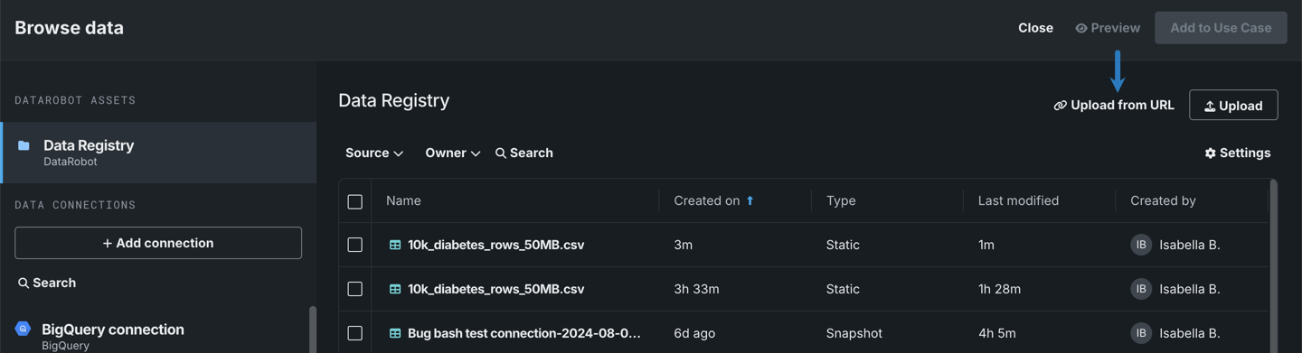 ユースケースにデータを追加する前に、データをキャンバスに直接ドラッグアンドドロップしたり、提供されている別のアップロードオプションを選択したりできます。