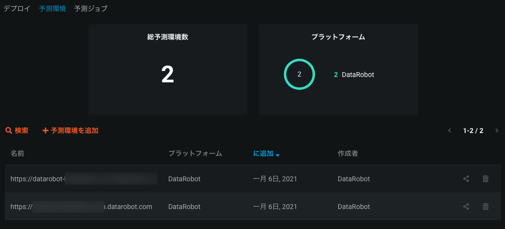 現在の正規版(GA)では、DataRobotの外部で実行されているデプロイの予測環境を管理できます。これにより、組織内から外部でモデルを実行しているさまざまなプラットフォームを完全に表すことができます。予測環境では、外部環境(ポータブル予測サーバー経由またはスコアリングコードを使用)でモデルをデプロイおよび監視する機能をサポートします。予測環境を作成してDataRobotに追加し、指定された環境でDataRobotモデルをデプロイして、DataRobotの外部で実行されるモデルのデプロイシナリオを確立します。
