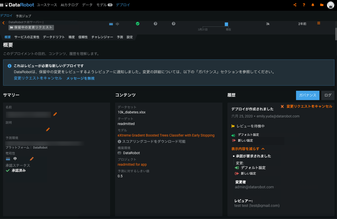 このリリースでは、ガバナンスワークフローを使用して、特徴量探索のデプロイのセカンダリーデータセットに対する更新を管理できます。管理者が「セカンダリーデータセット設定の変更」承認ポリシートリガーをユーザー設定 > 承認ポリシーで設定した後にセカンダリーデータセットに変更を加えようとすると、承認プロセスが必要な変更リクエストのプロンプトが表示されます。変更リクエストの作成者は、そのステータスを履歴(デプロイ > 概要)に表示でき、レビュー担当者には、更新のレビューを要求する保留中の変更通知が表示されます。
