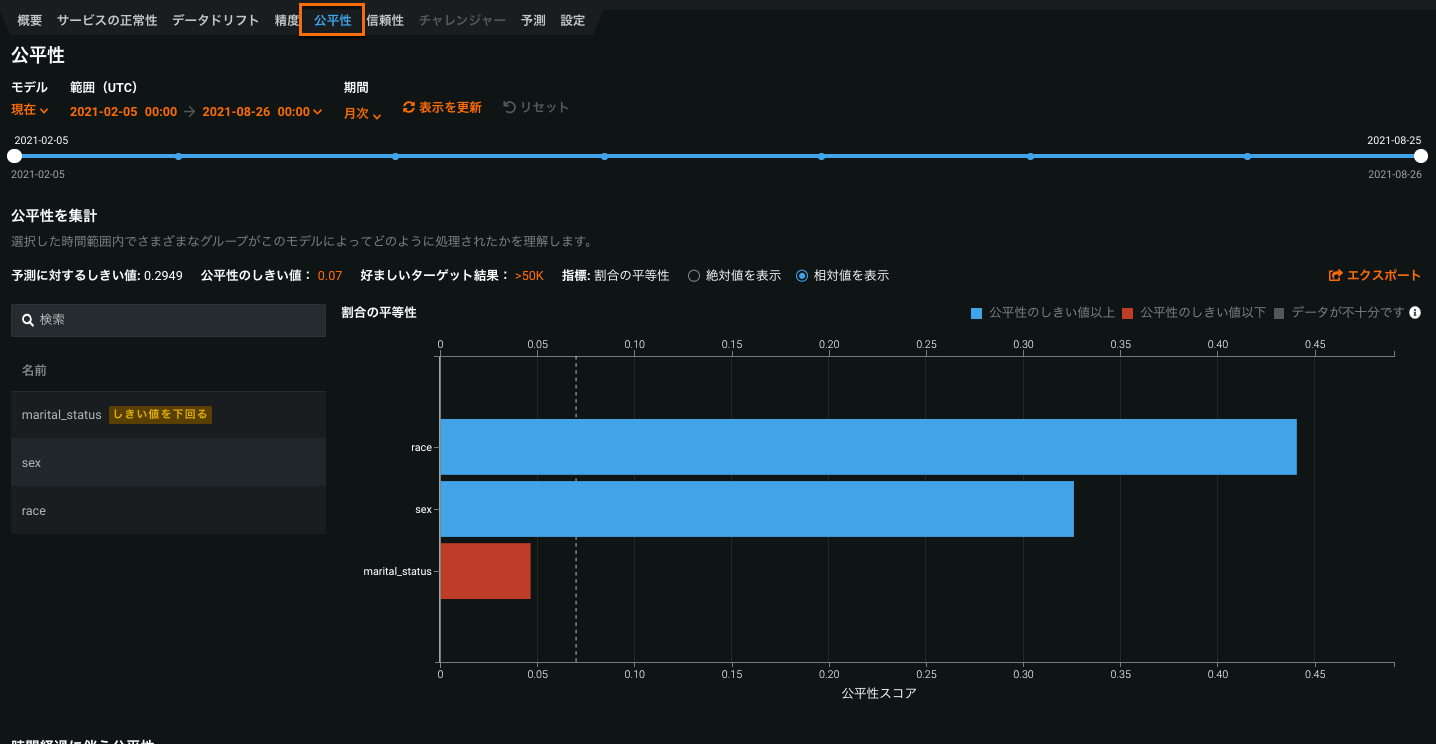 現在の正規版にあるMLOpsの「バイアスと公平性」では、デプロイされた運用モデルの公平性を時系列で監視し、モデルが保護対象クラスに対して異なる動作を始めたときに通知を受け取ることができるようになります。