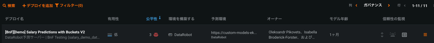ガバナンスレンズでデプロイインベントリを表示すると、公平性の列には、公平基準に基づいて各デプロイがどのように実行されているかが一目でわかるように表示されます。